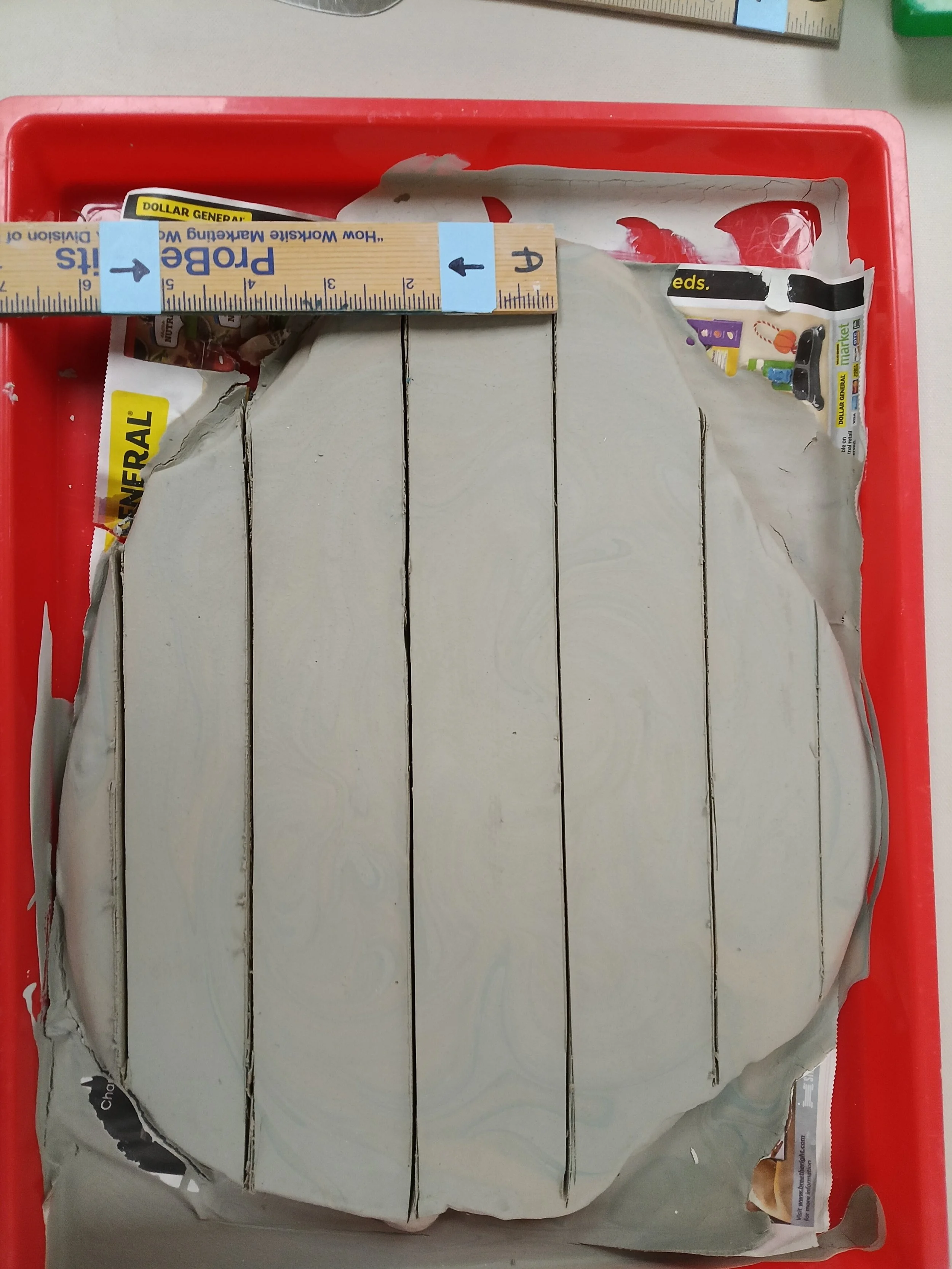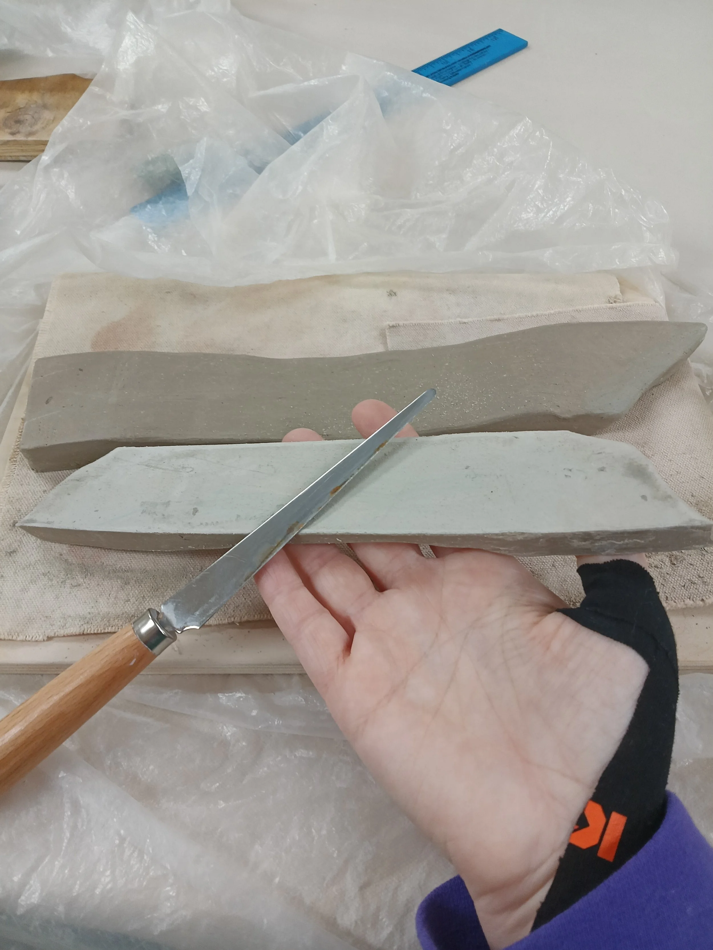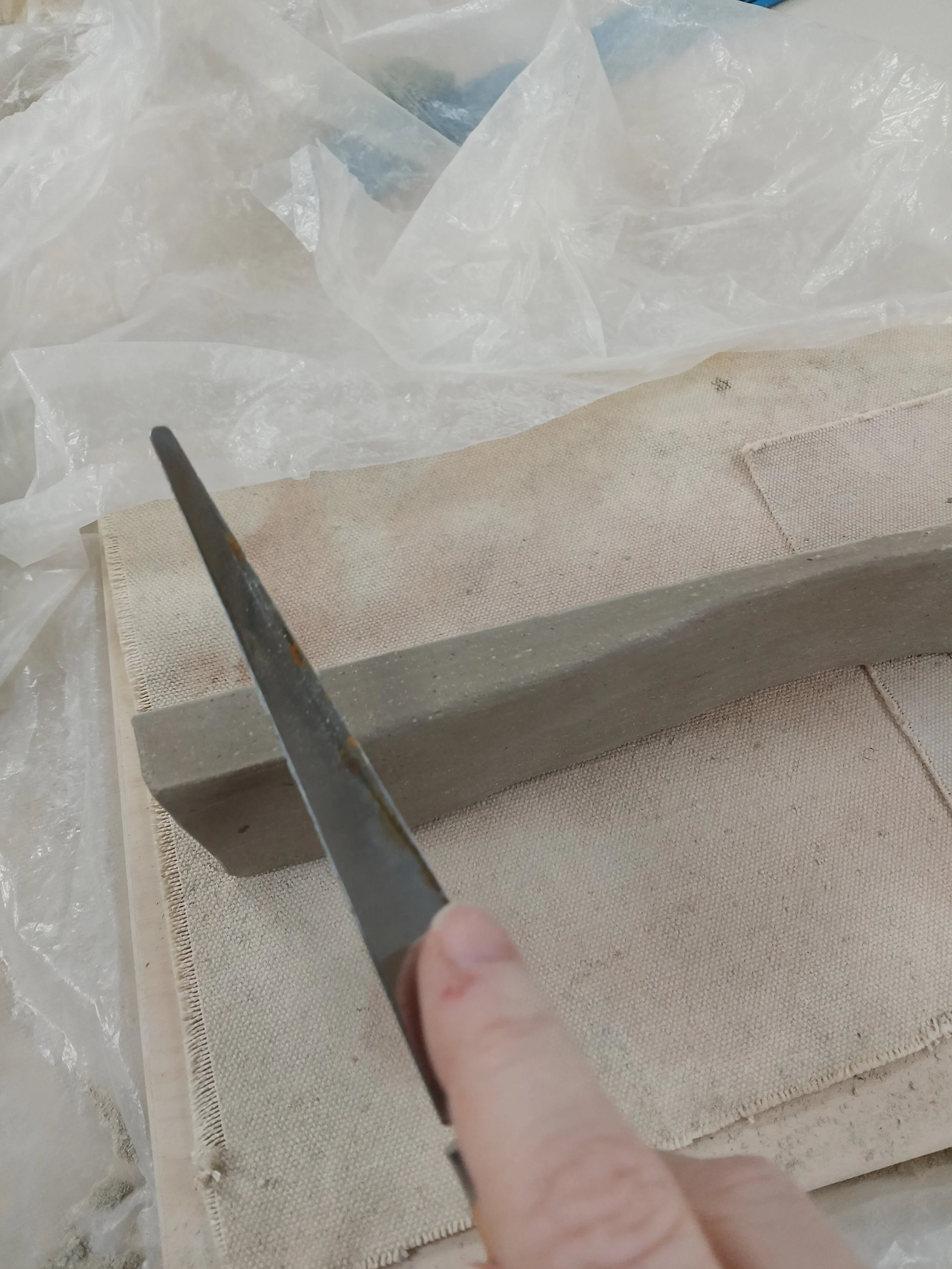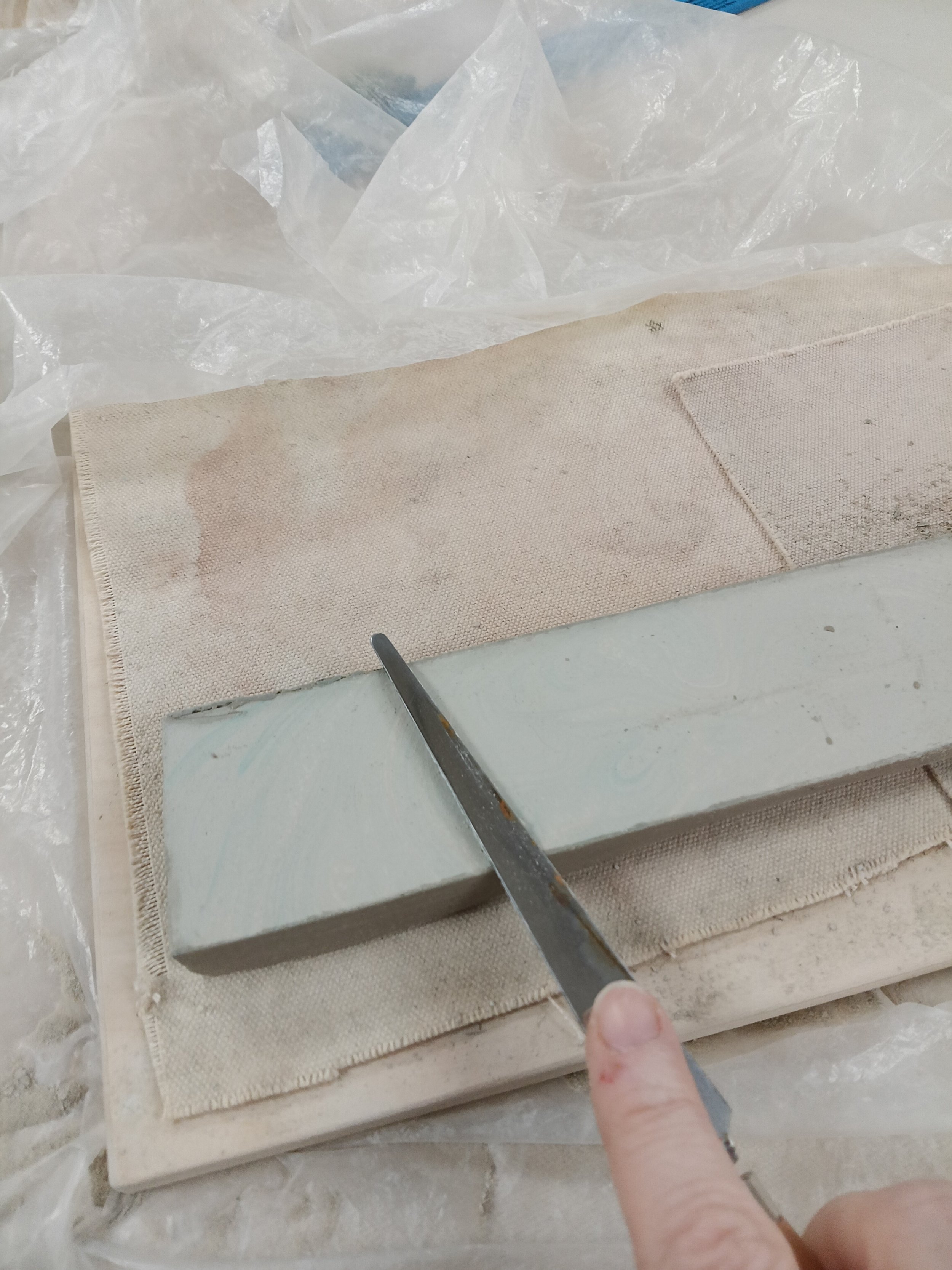 I rolled out a very think slab of white clay. Then it was placed on wood with canvas on top and wrapped with 2 pieces of plastic.