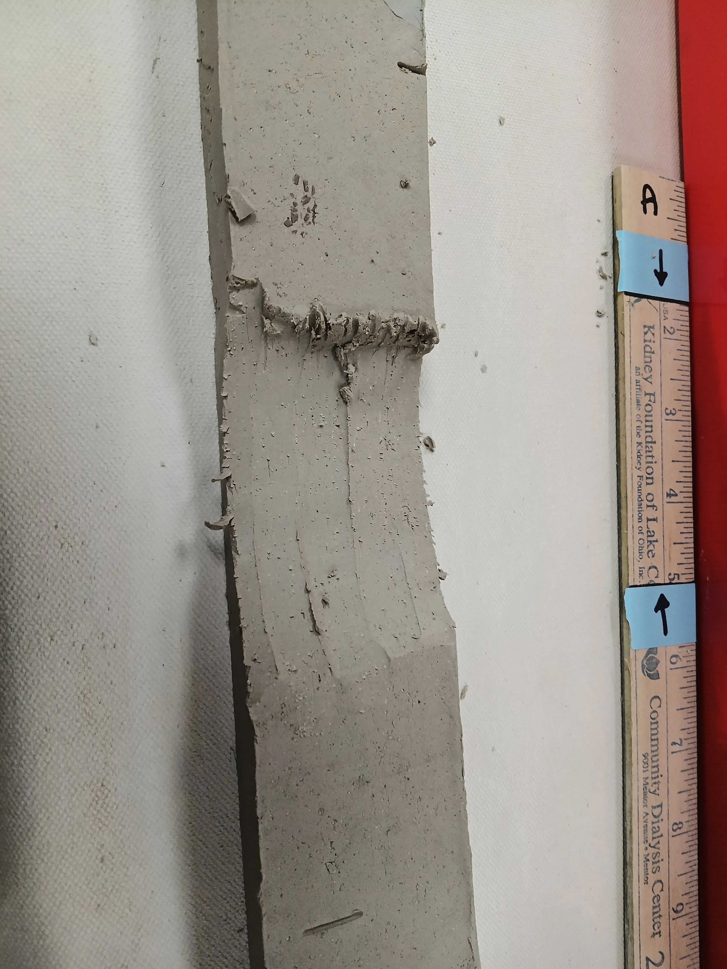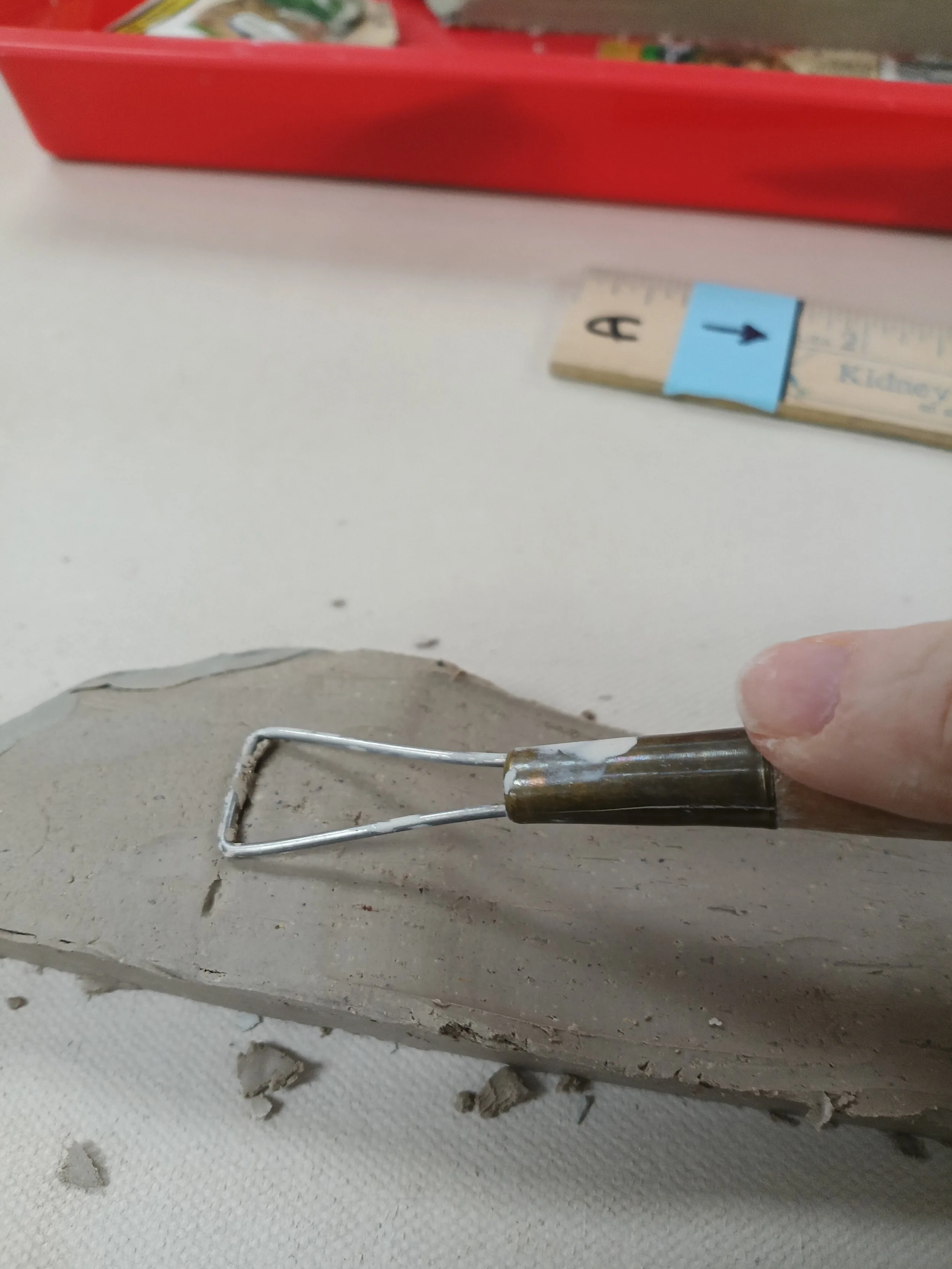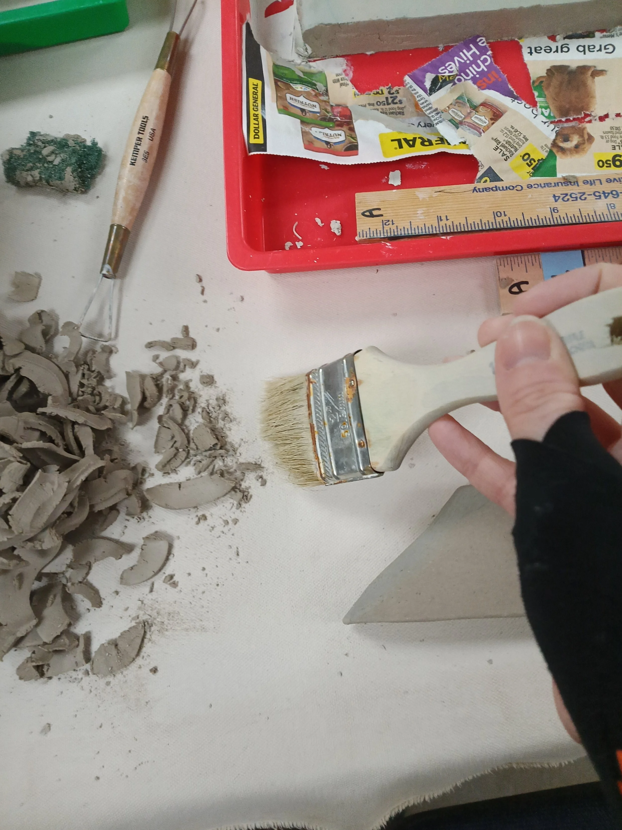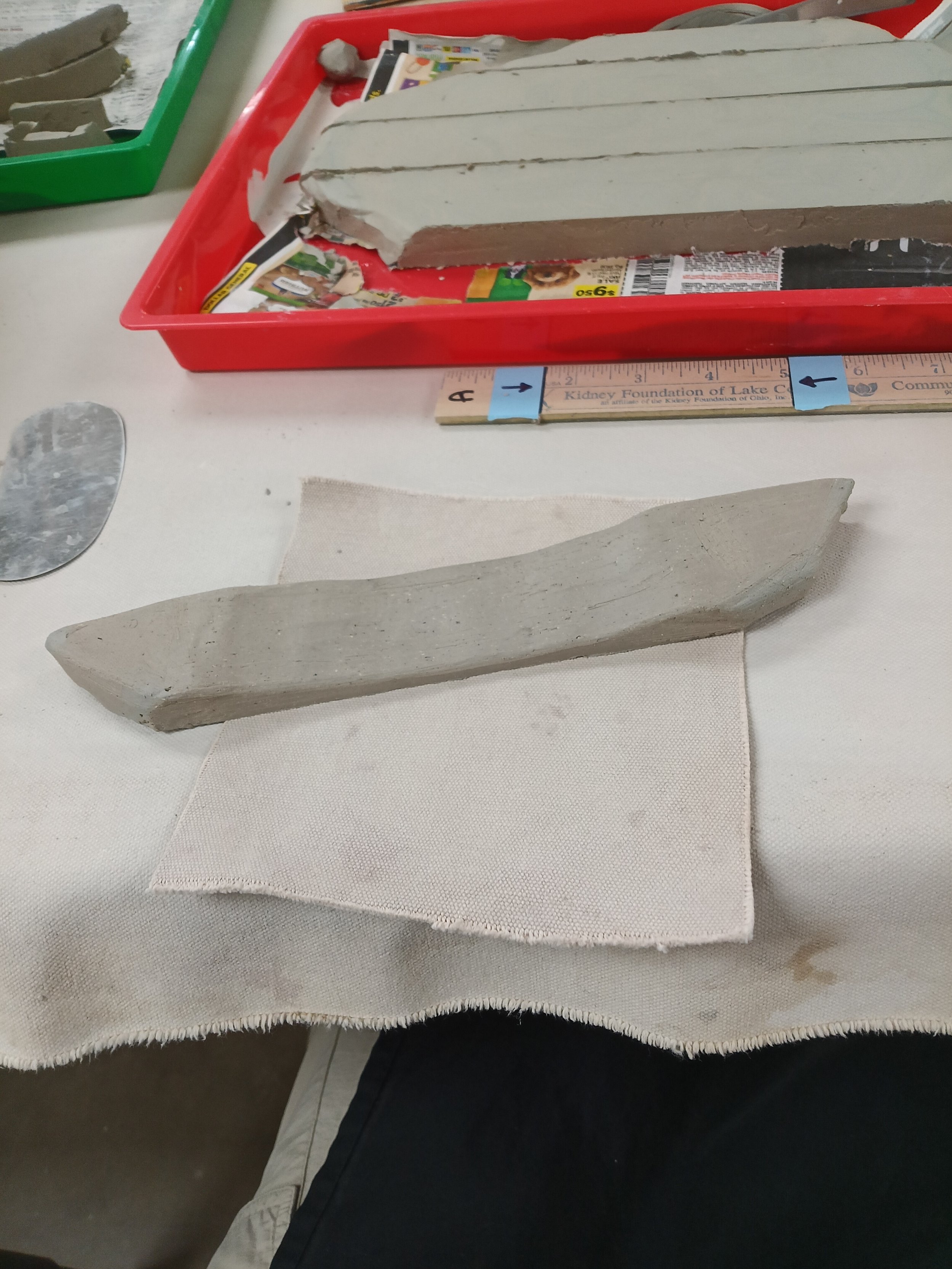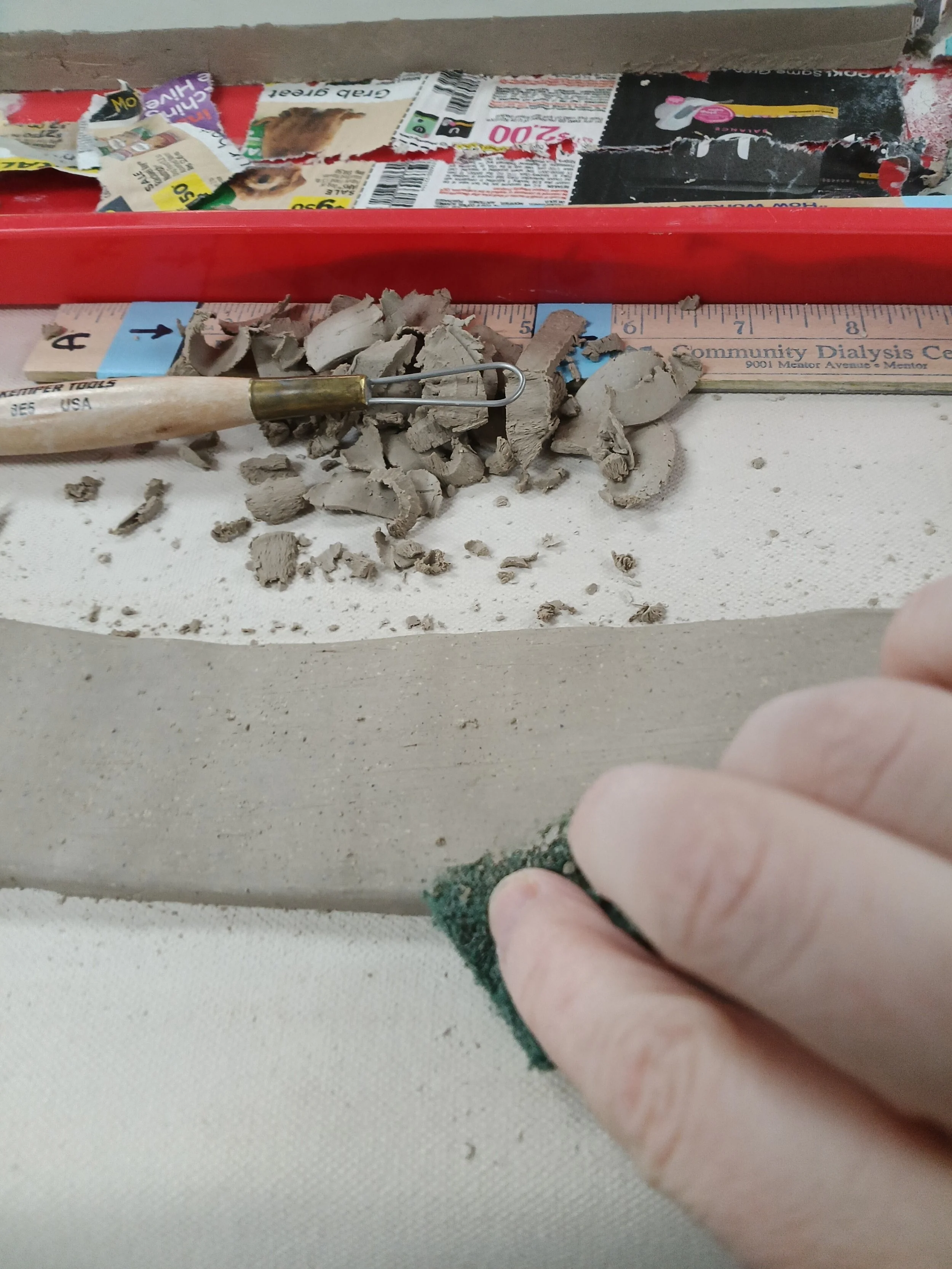 During this process, things will get very messy and little pieces of clay will get everywhere. It is important to keep a clean area to avoid those little pieces getting stuck on the bottom where the pretty marbling is. Use a large brush and scraping tool to clean those away. If you must move your bar, DO NOT PICK IT UP with your hands. This risks it breaking in two or bending it so it might warp or break later. If you haven’t done so already, slide a little piece of canvas carefully underneath it, and pull it with the little piece of canvas.