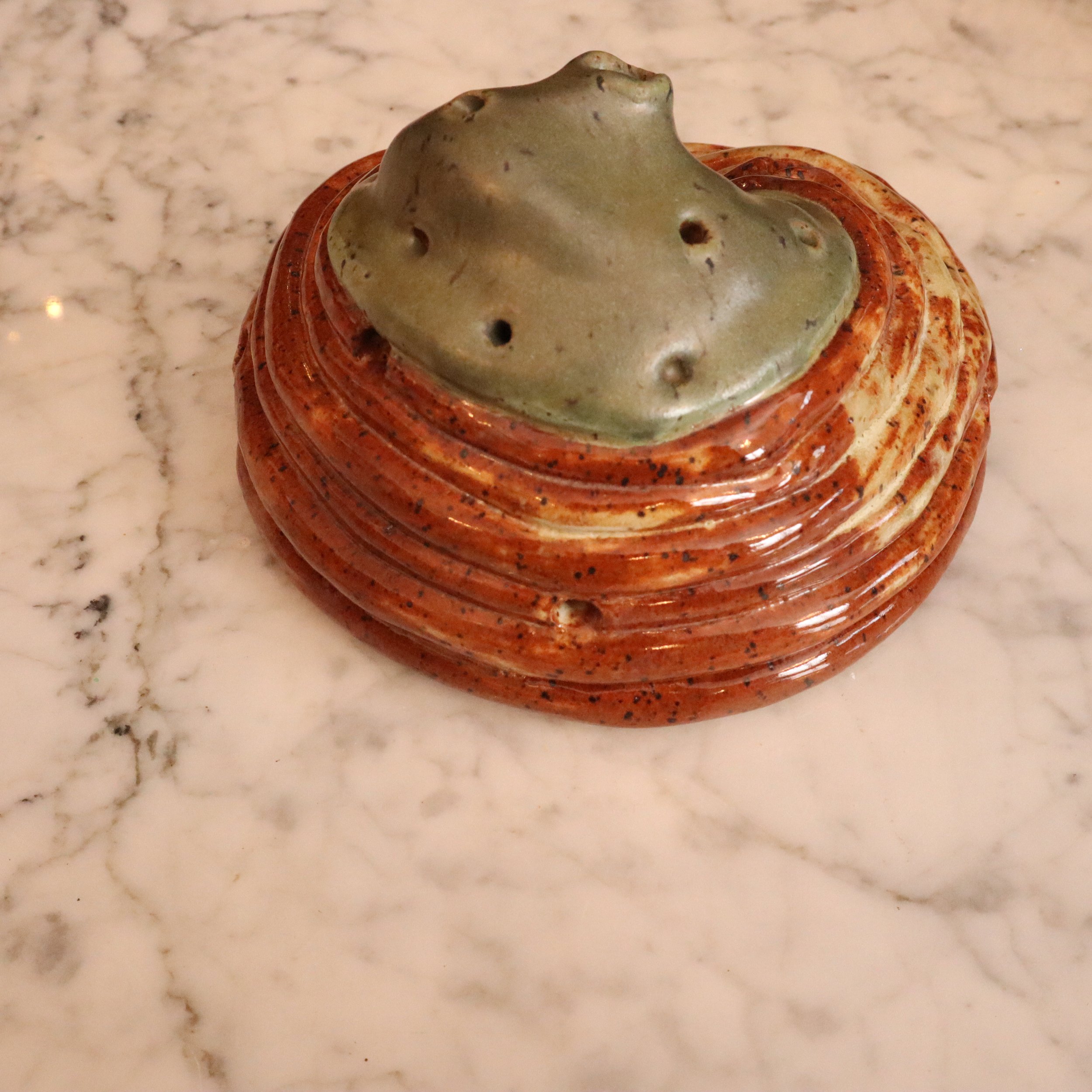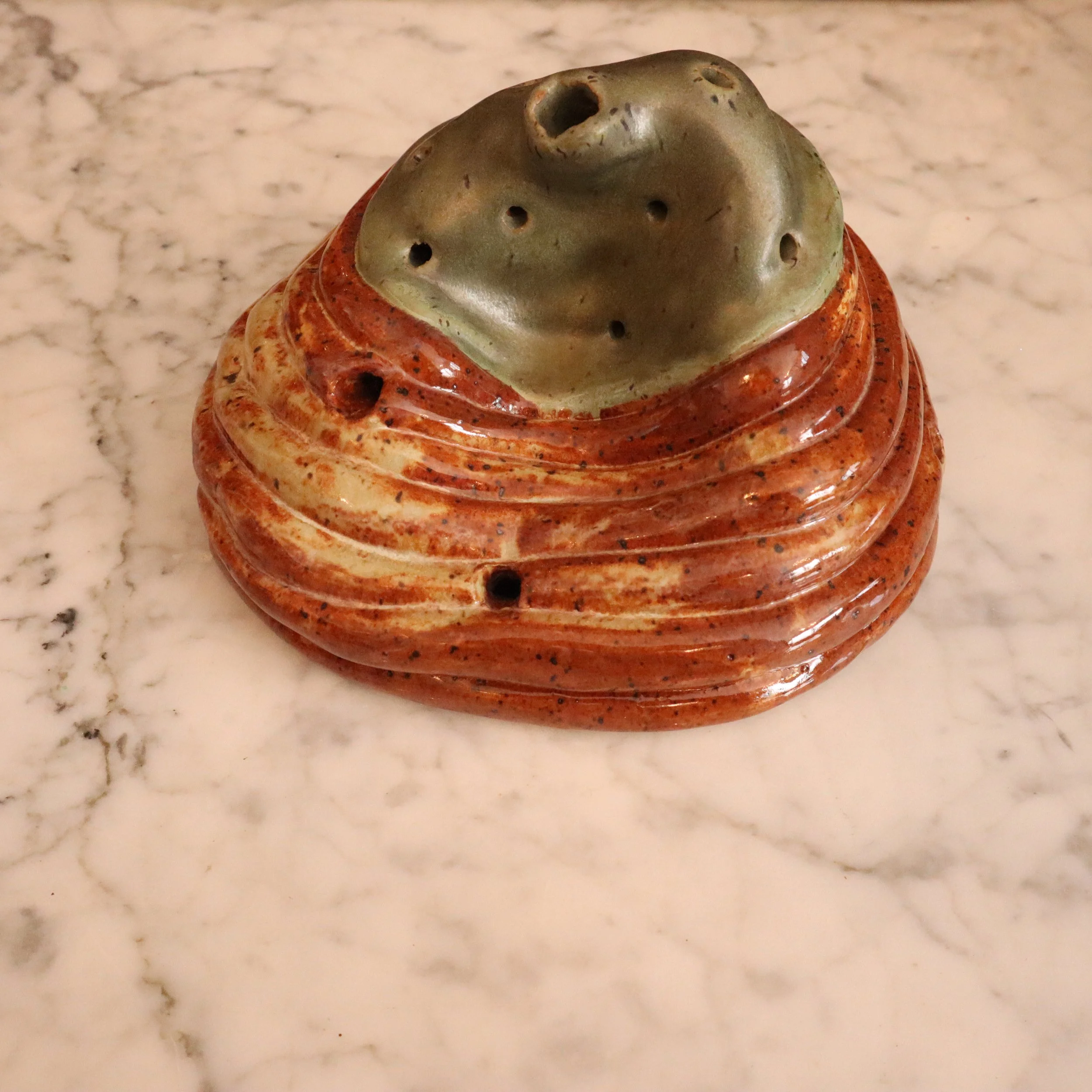 Here is a photo of the first wind chime I made. This is the top part of the wind chime, meant to be the main body for suspending the little chimes. I coiled the clay into a sort of cone shape, and then experimented with distorting this shape to make it look a bit more funky. I then glazed the top part with 4 coats of ‘green tea.’ The bottom part is ‘lido’ (2 coats) and maycoshino (2 coats).